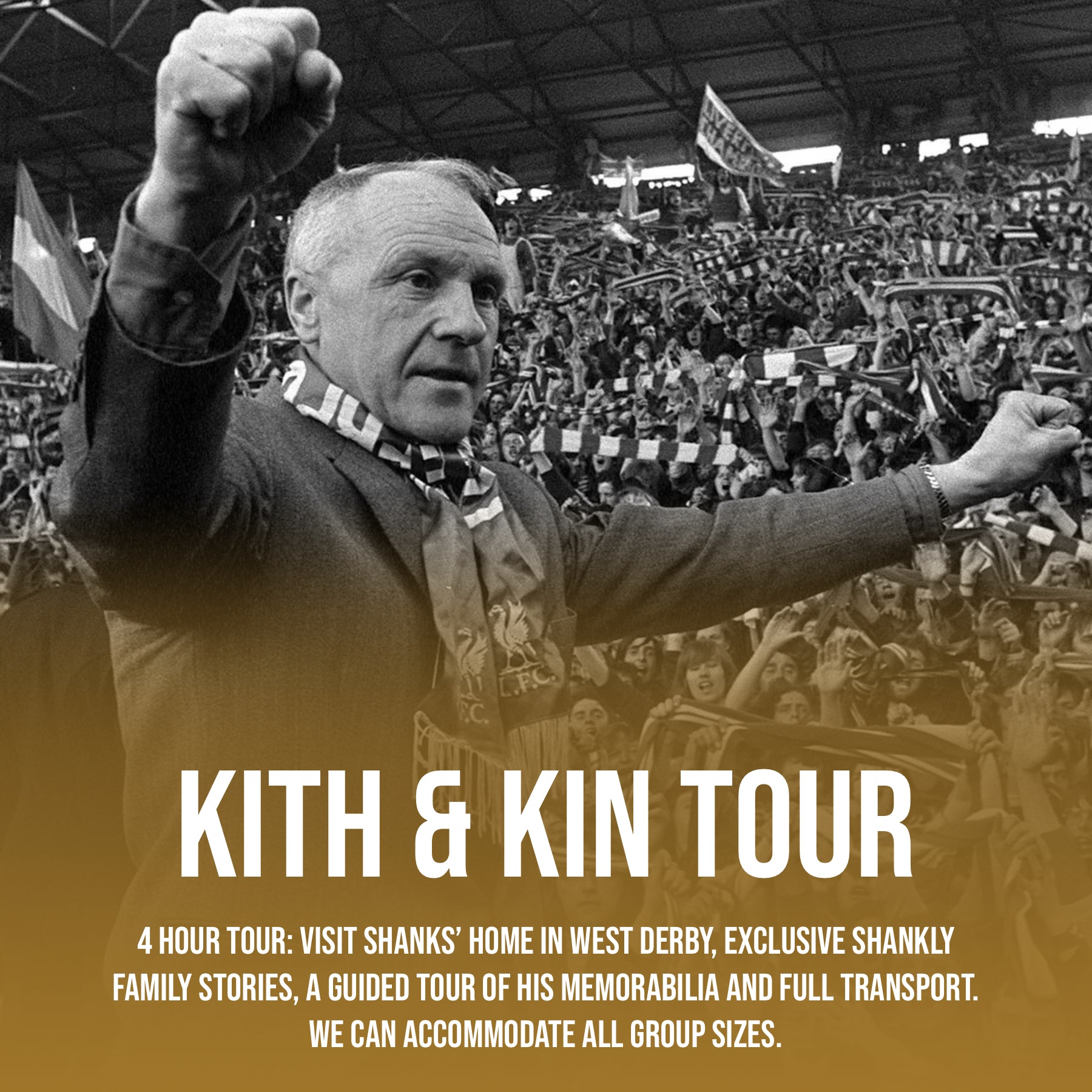 A more intimate 4-hour experience focused solely on Bill Shankly and his story. Visit his former home in West Derby and explore The Shankly memorabilia with a member of the Shankly family, hearing exclusive stories that bring the man and his legacy to life. Includes private guide and full transport.